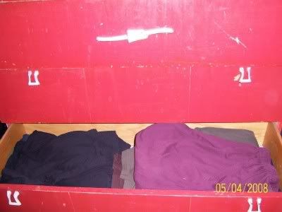 Okay. I did it. I cleaned out ONE drawer. I chose my slacks drawer. This drawer holds all slacks and capris that don't go on a hanger. The odds and ends I found in there: a boob, tissue paper for gift wrapping, buttons, two missing tank tops, and a heating pad. Now it's all clean! Thanks.