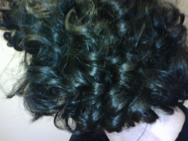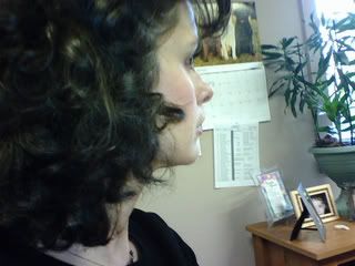 Here are a couple of hair shots from the back (very difficult to take BTW) and side. I've been using the Hemp Alterna product and my new pancake hairdryer, and the frizzies are not as bad as before (you may all beg to differ...).