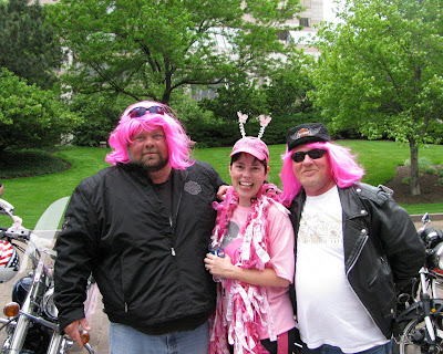 Norm. Here's me in my pink boa, with two of the gazillion bikers who rev their bikes as folks are coming down the last stretch of the walk. Truly one of the most emotional parts of the walk for me. The bikers give high 5's to anyone wanting one. I'd bet there were close to 200 bikes up on the sidewalk.