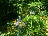 Here are some pics of my backyard.....as luck would have it, the sun was hitting it at that time...it gets several hours of sun late afternoon, but for the most part is shade. I have hollyhocks and coneflowers and clematis and things that love the sun on the side and front of the house and of course as you can see, the lilies are everywhere. They don't seem to care what type of soil or conditions, they just g