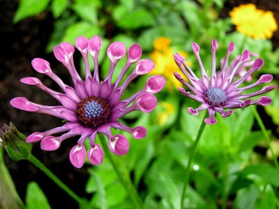 Good Morning Ladies. I believe that the purple flower is a form of African Daisy. The petals are sometimes referred to as spoons. I have the normal African Daisies in my yard. Maybe I'll try the "Spoonies" someday.