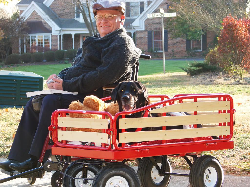 My beautiful lab Libby broke her back at the age of 5 and was paralyzed for 3 months before regaining her ability to walk. In her later years her inability to walk returned and for the last 1.5 years of her life I had to lift her in and out of her little red wagon we used to take her for walks thru the neighborhood or make a visit to the vet. This was all after my LE dx and it was a matter of finding the right assistive devices and proper body mechanics for me to safely transport her. Libby weighed 95lbs at her peak and 80lbs before she passed in 2008 just 3 months shy of her 15th birthday.